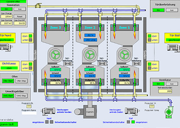 Die Schnittstelle zum Prozess bildet die in Steuerschränken untergebrachte Steuerungs-Hardware (SPS) mit der spezifischen Steuerungs-Software.
