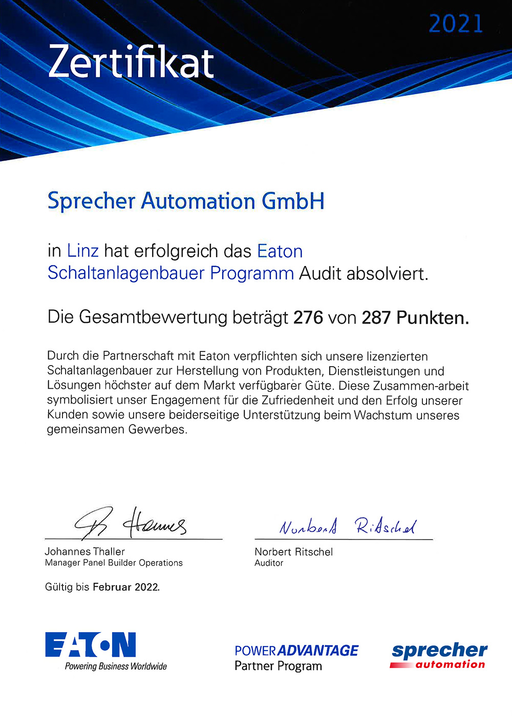 Die Qualität der Sprecher-Schaltanlagen wurde auch von Eaton bestätigt und zertifiziert. Wir sind als einziges Unternehmen in Österreich Partner im Eaton EMEA Panelbuilder Programm (Stand: 21.09.2021) und verpflichten uns damit zu höchster Qualität bei Produkten, Know-how und Kundenzufriedenheit. Regelmäßige Audits stellen sicher, dass diese Ansprüche jederzeit gewahrt sind.