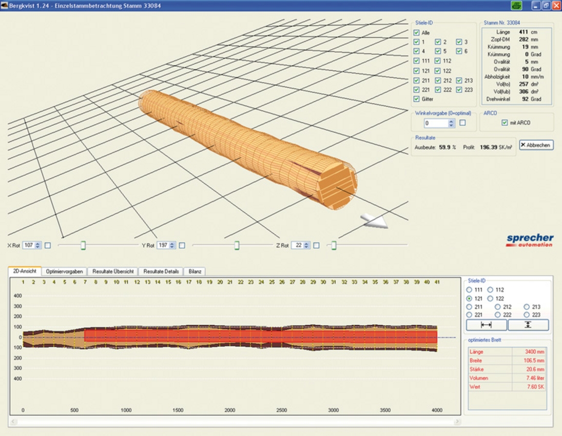 Neben den installierten Messystemen entwickelte Sprecher Automation auch ein Software-Paket zur Einschnittsimulation mit Berechnung der echten Ausbeute. Die Simulation basiert dabei auf den realen Scan-Daten der 3D-Messungen, dem Schnittbild und den Optimierparametern.